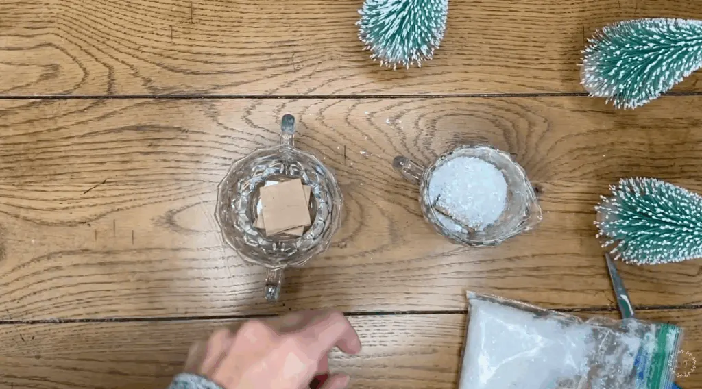 I tucked little bottle brush trees into a mismatched cream and sugar set from a thrift haul. A few pieces of cardboard in the bottom added height, then I covered them with faux snow so the trees looked perfectly nestled in.