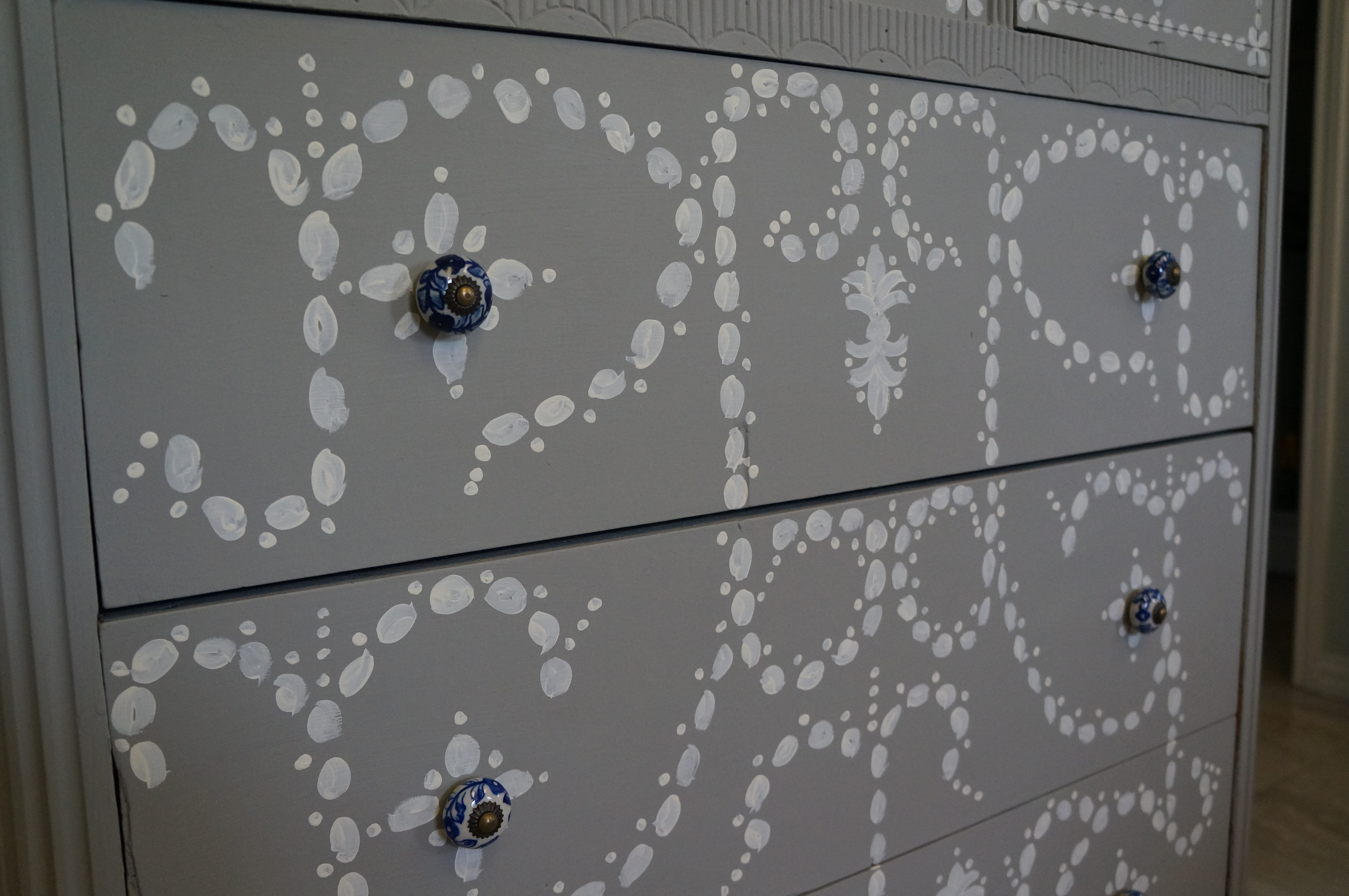 So, I decided to add some detail back by creating a hand-painted design on the drawers fronts. It would also help mask the small chipped spots.