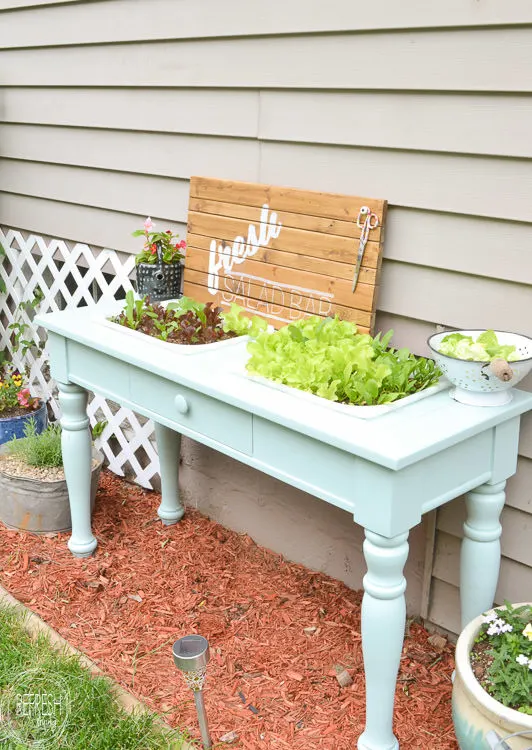Lastly, how about Jenny, from Refresh Living! She turned an old sofa table into potting table, complete with small gardening beds!