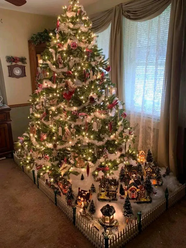 Under the tree. Build a village nestled next to or under your tree, and take advantage of existing plugs for tree lights.